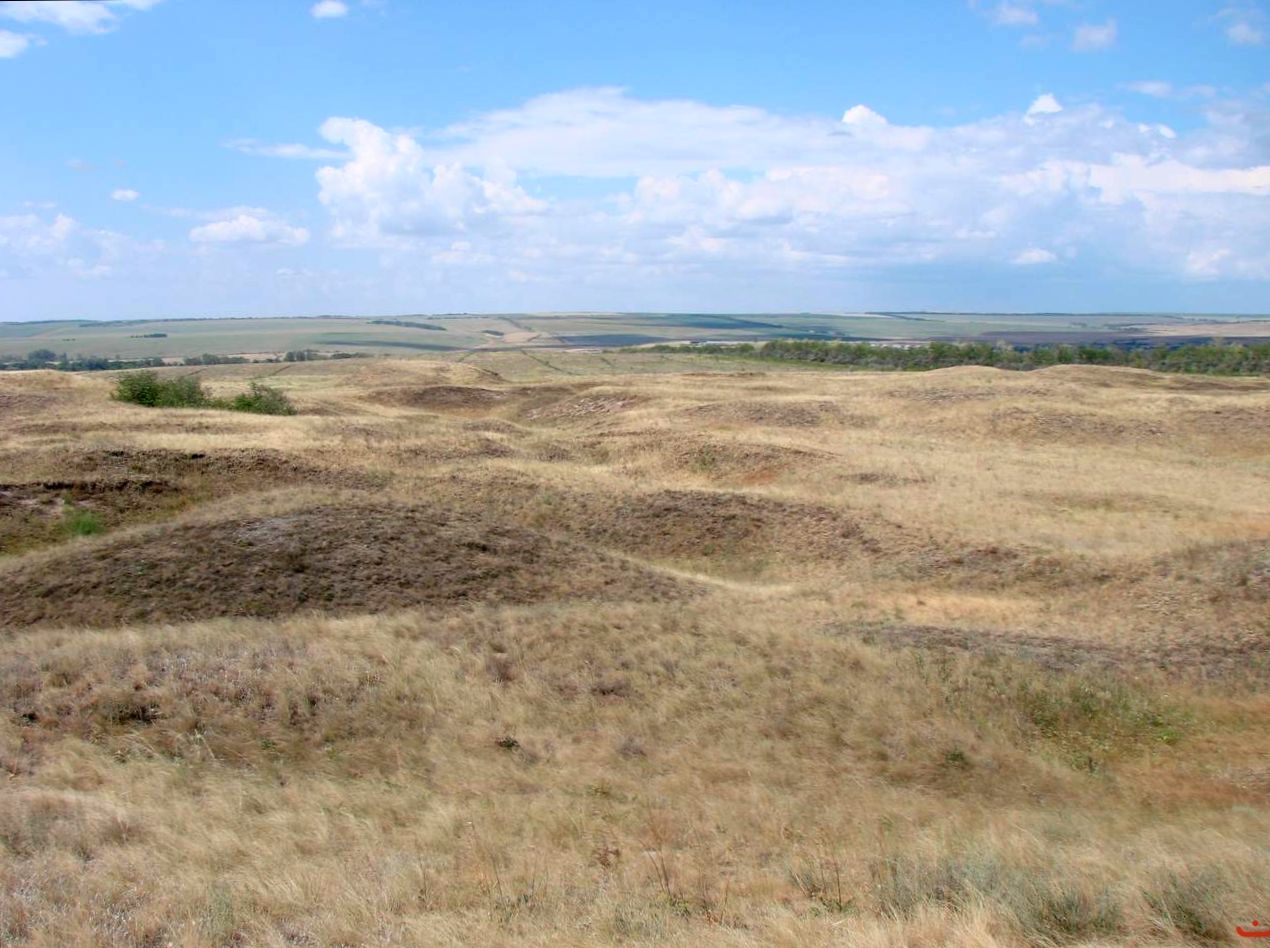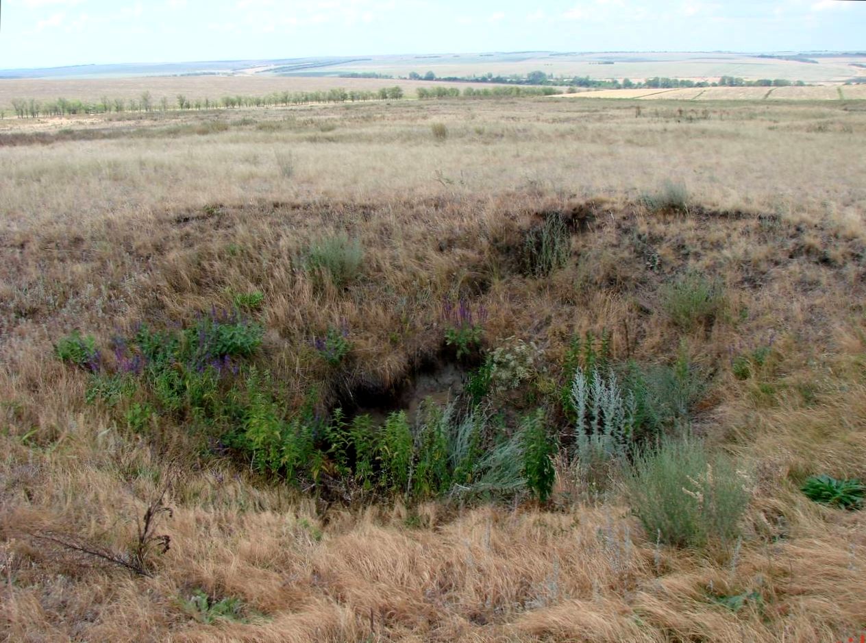 Остатки шахт виднеются не только в поле вокруг оврага, но и на склонах холмов расположенных севернее. Одни провалы совсем небольшие до полуметра в глубину. Другие же достигают в глубину нескольких метров и имеют проходы под землю. Исследовать их без специальной подготовки и снаряжения не стоит.