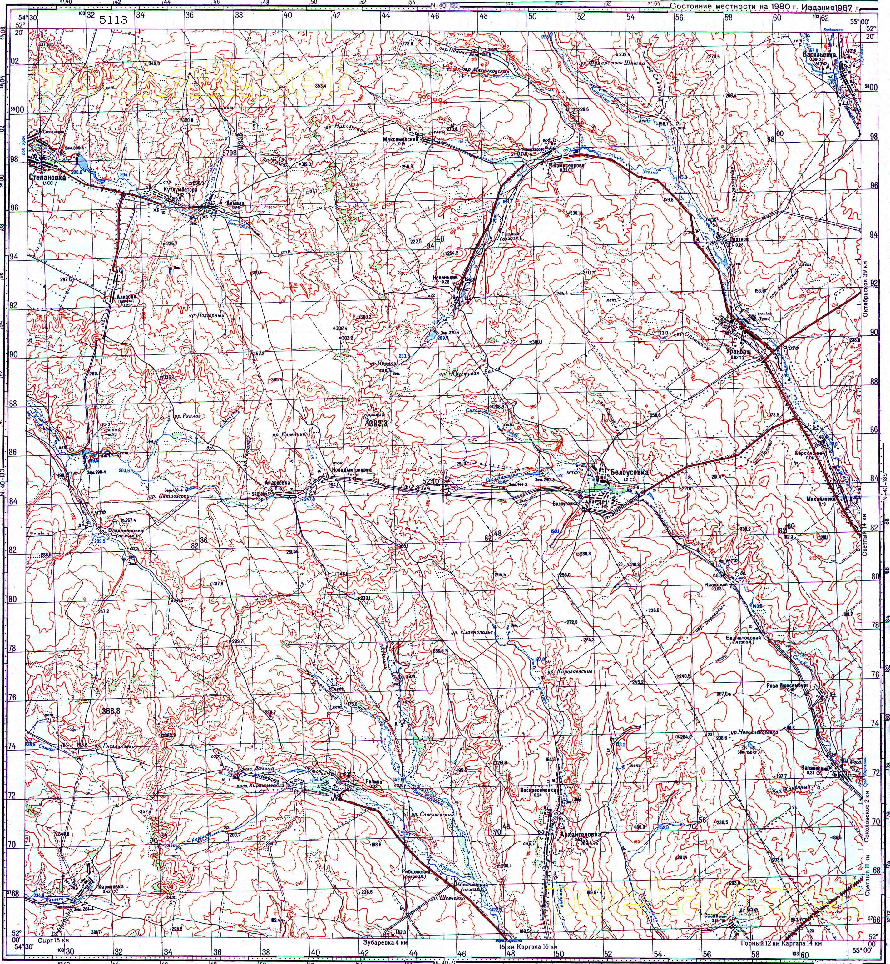 Карта генерального штаба, квадрат N-40-134. Состояние местности на 1980 г. Издание 1987 г. Одна из самых подробных карт района Каргалинских рудников. Несмотря на год издания карта остается актуальной по сей день.