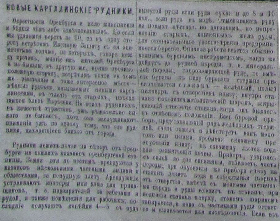 Окрестности Оренбурга и мало живописны и бедны чем либо замечательным. Но если мы удалимся верст за 60, то в одну сторону встретим Илецкую Защиту с ея знаменитыми копями, на которых, говоря между прочим, многие из жителей Оренбурга и не бывали; в другую же, прямо противоположную сторону, встретим почти на том же расстоянии и тоже интересное место – медные рудники, называемые новыми каргалинскими, в отличие от старых, находящихся близ Марьевки. На этих рудниках, в качестве туристов, уже решительно никого не бывает, хотя они заслуживают внимания уже по одному тому, что это рудники, находящиеся близко от города.