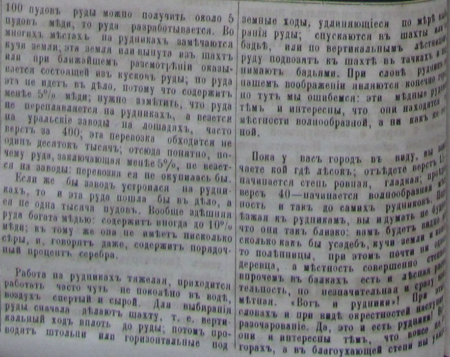 Пока у вас город в виду, вы встречаете кой где лесок; отъедете верст 15… начинается степь ровная, гладкая; проедете верст 40 – начинается воднообразная местность и так до самих рудников. Подъезжая к рудникам, вы и думать не будете, что они так близко: вам будет видно несколько как бы усадеб, кучи земли и какие-то поленницы, при этом почти ни одного деревца, а местность совершенно степная (?) впрочем в балках есть и лесная растительность, но незначительная и сразу незаметная. «Вот и рудники»! При этих словах и при виде окрестностей наступает разочарование. Да, это и есть рудники! Вот они и интересны тем, что вовсе не в горах а в благоухающей степи вы увидите добывание прекрасной медной руды и так недалеко от Оренбурга. Остановиться можно в конторе или на хуторах, которых здесь несколько. Тут можно получить самовар, молока, яиц, масла, а летом всякой огородины и ягод. Воздух на рудниках прелестный, ароматный, здоровый; множество цветов; есть речка Каргалка, в которой можно купаться и ловить рыбу, любители ягод найдут множество клубники и вишни. Для осмотра возьмем напр. Рудник графини Коссаковской. Рудник лежит на покатости; глубина шахты 46 сажень, руда водная; вода постоянно откачивается насосом, приводимым в действие лошадьми; когда же ее накопится много, то действуют и бадьями. В шахту спускаются по лестницам со свечой в одной руке, что не совсем удобно при спускании, да еще по совершенно вертикальным, скользким лестницам. Когда я спускался, то свеча два раза гасла, приходилось, держась одной рукой, нагибаться и зажигать свечу у провожатого; наконец достигаем штольни; штольня сырая и такая низкая, что приходится сгибаться под прямым углом, а если по забывчивости захочешь выпрямиться, то больно ударишься спиной о потолок; рабочие при провезении руды сбивают спину до крови. В некоторых местах штольня укреплена сваями (породы сопровождающие руду песчаниковые или глинистые); по полу штольни бежит вода четверти на полторы, и приходится идти широко расставив ноги, ступая на возвышенные бока пола. Через несколько минут перед вами открываются и копи. Они представляют вид большой, низкой, неправильной комнаты, в стенах которой пятнами зеленеет и синеет руда; потолок подперт неправильной формы столбами рудных пород и руды; в некоторых местах из стен пола бьют ключи чрезвычайно холодной воды. От странствований пот с меня лил ручьями, да к тому же я оделся в армяк, чтобы не выпачкаться. Рабочие, смотря на меня, посмеивались: «что, барин, жарко; с непривычки; а мы вот ничего, ходим, только спины посодраны. Небось пить хочется, продолжал один: а водичку эту нельзя пить, больно жесткая» (сильно насыщена медными солями). Редкие сальные свечи тускло освещают сырые копи. Куски руды отбиваются с помощью стальных клиньев, по которым бьют тяжелым молотом. Я отбил кусок пуда в два, а больше не мог, руки молотка не поднимают, а молоток-то 35 фунтов.