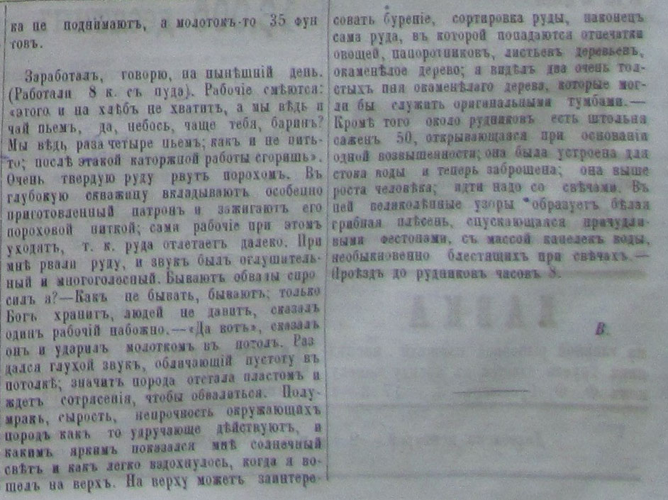 Заработал, говорю, на нынешний день. (Работали 8 к. с пуда). Рабочие смеются: «этого и на хлеб не хватит, а мы ведь и чай пьем, да, небось, чаще тебя, барин? Мы ведь раза четыре пьем; как и не пить-то; после этакой каторжной работы сгоришь». Очень твердую руду рвут порохом. В глубокую скважину особенно приготовленный патрон и зажигают его пороховой ниткой (?); сами рабочие при этом уходят, т.к. руда отлетает далеко. При мне рвали руду, и звук был оглушительный и многоголосный. Бывают обвалы спросил я? – Как не бывать, бывают; только Бог хранит, людей не давит, сказал один рабочий набожно. – «Да вот», сказал он и ударил молотком в потол. Раздался глухой звук, облачающий пустоту в потолке; значит порода отстала пластом и ждет сотрясения, чтобы обвалиться. Полумрак, сырость, непрочность окружающих пород как то удручающе действуют, и каким ярким показался мне солнечный свет и как легко вздохнулось, когда я вошел на верх. На верху может заинтересовать бурение, сортировка руды, наконец сама руда, в которой попадаются отпечатки овощей, папоротников, листьев деревьев, окаменелое дерево; я видел два очень толстых пня окаменелого дерева, которые могли бы служить оригинальными тумбами. – Кроме того около рудников есть штольня сажень 50, открывающаяся при основании одной возвышенности; она была устроена для стока воды и теперь заброшена; она выше роста человека; идти надо со свечами. В ней великолепные узоры образует белая грибная плесень, спускающаяся причудливыми фестонами, с массой капелек воды, необыкновенно блестящих при свечах. – Проезд до рудников часов 8.
